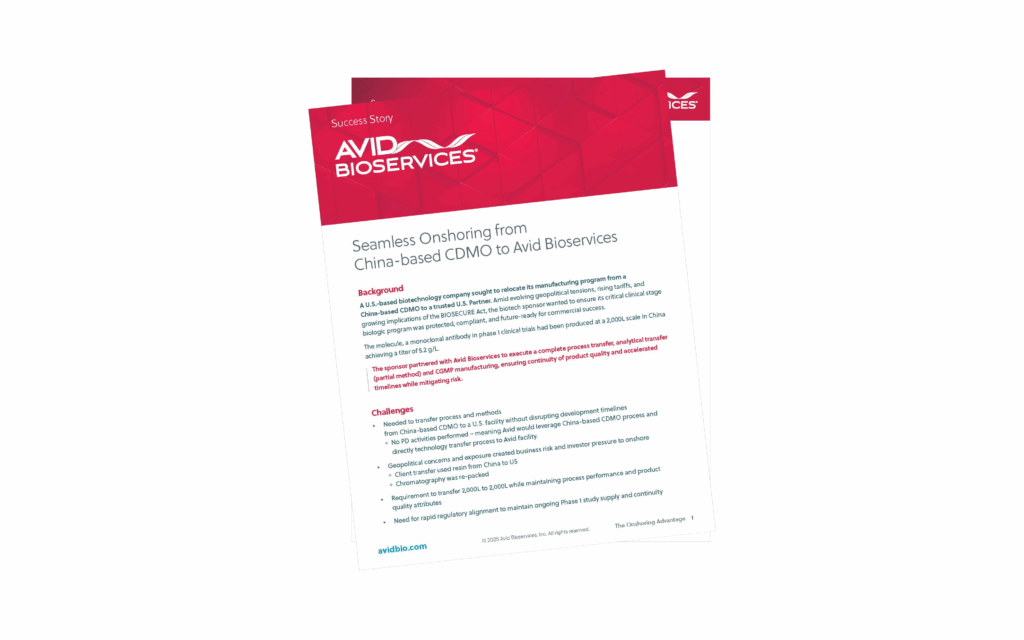 Seamless Onshoring from China-based CDMO to Avid Bioservices Background A U.S.-based biotechnology company sought to relocate its manufacturing program from a China-based CDMO to a trusted U.S. Partner. Amid […]